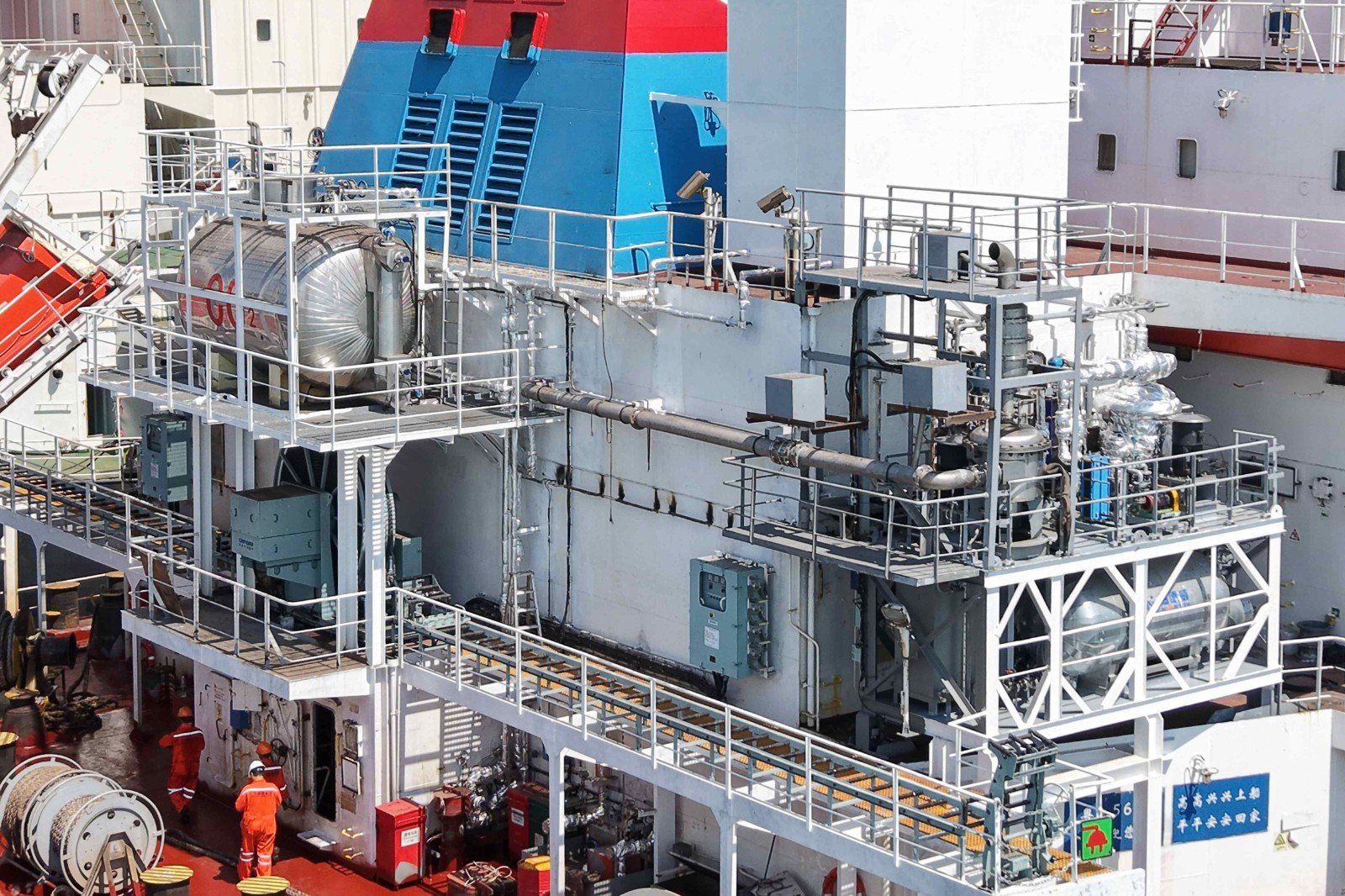海洋衛士?船載碳捕集系統依托海德威自主設計的高速離心脫碳技術和高性能吸收劑,以高速旋轉形成的離心力場替代傳統重力場,顯著提升了氣液兩相傳質效率,系統脫碳效率超過90%,二氧化碳捕集純度可達99.6%以上,具有脫碳效率高、體積小、能耗低、安裝及儲運便捷等優勢。