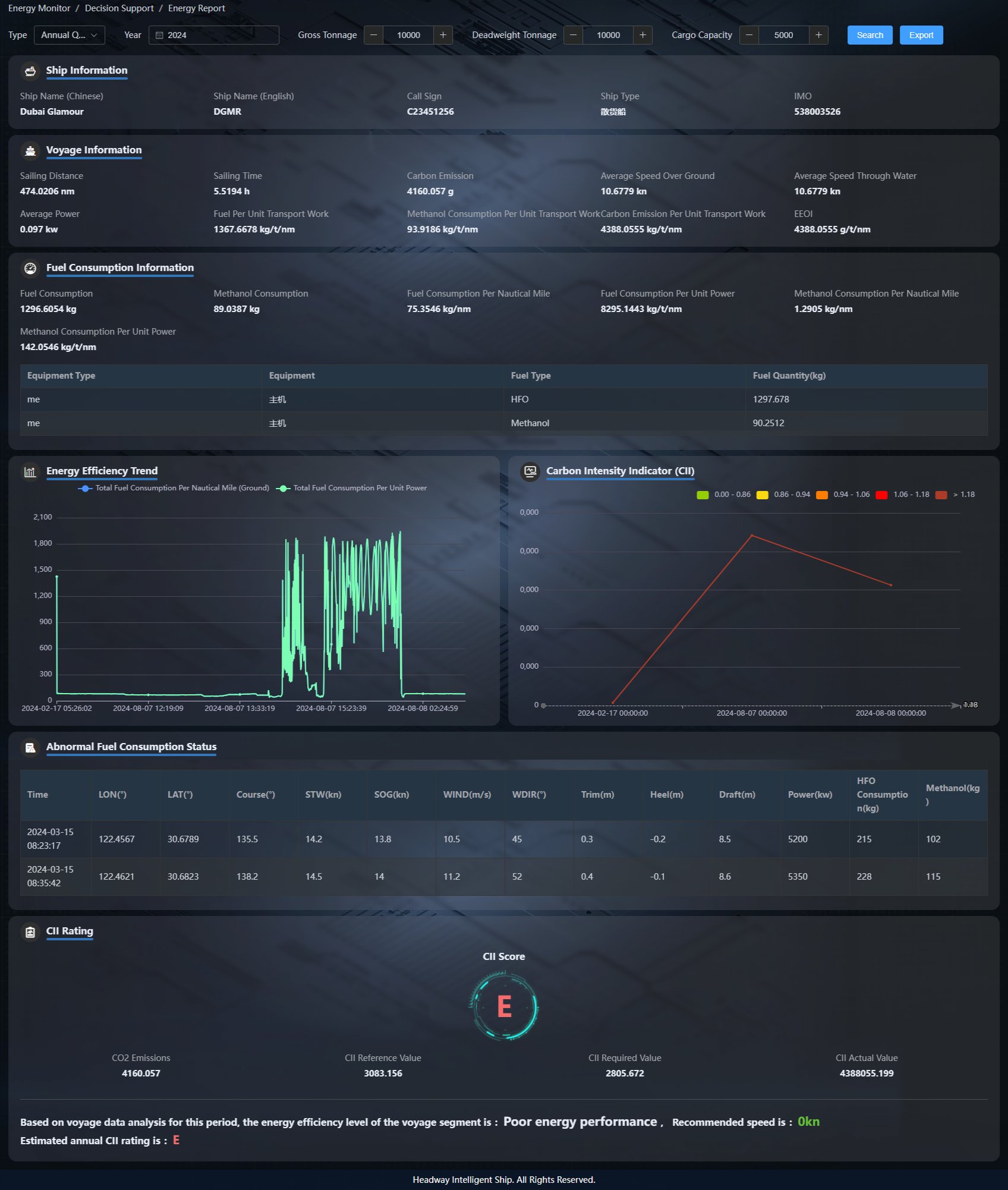 基于智能信息集成平臺,實時監測船舶航行各個關鍵指標,運用現代化船舶能效管理的系統性方法,對船舶能源消耗、能源利用效率和二氧化碳排放進行嚴格的控制和管理,提高船舶能效,減少設備自身或人為因素造成的額外消耗,實現船舶節能減排的能效要求,推動航運綠色發展。